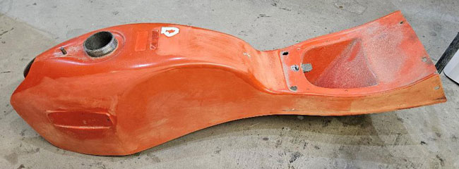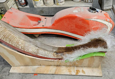 John Metz, a fellow retired flat tracker, is an OSSA expert. He has a very tired Pioneer body he wants to bring back to life so down the road he can flip it. OSSA made very thin fiberglass body parts to save weight. Good on the 1970s sales floor but not so good 50 years later.
