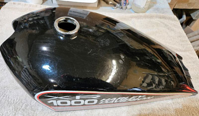 In desperation, he called Mark Appleton at British Cycle in Nova Scotia & Maine. Somehow, Mark knew I repaired glass tanks. Jim honed in on me and away we went with his repair. (Mark is a big Hagon shock seller if you have a need.)