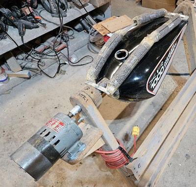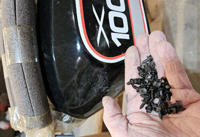 My repair will be simple. To protect the tank long term the inside will be Caswell coated. Below is the tumbler and medium (motorcycle ice screws) I use to rough the interior. Then I’ll sand and polish the outside. Black is a miserable color because it shows minute imperfections. I’ll have to sand/polish several times to make it perfect.