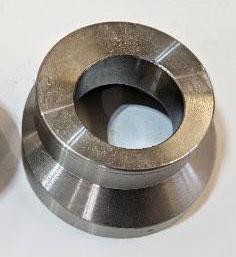 3. Clean the steering head bottom thoroughly. Test fit the snugness of your bottom concentric cup in the steering head. It is machined for a press fit. If the bottom cup is sloppy, you’ll need to drill a 3/16” hole through the steering head and part way into cup to lock the two together with a 3/16” roll pin. The roll pin must be deep enough to create strength from banging of the steering stops on your lower tree. Don’t drill into the bearing area. Not good! Position so the fat steering stop tab is straight forward. Install cup in tree.