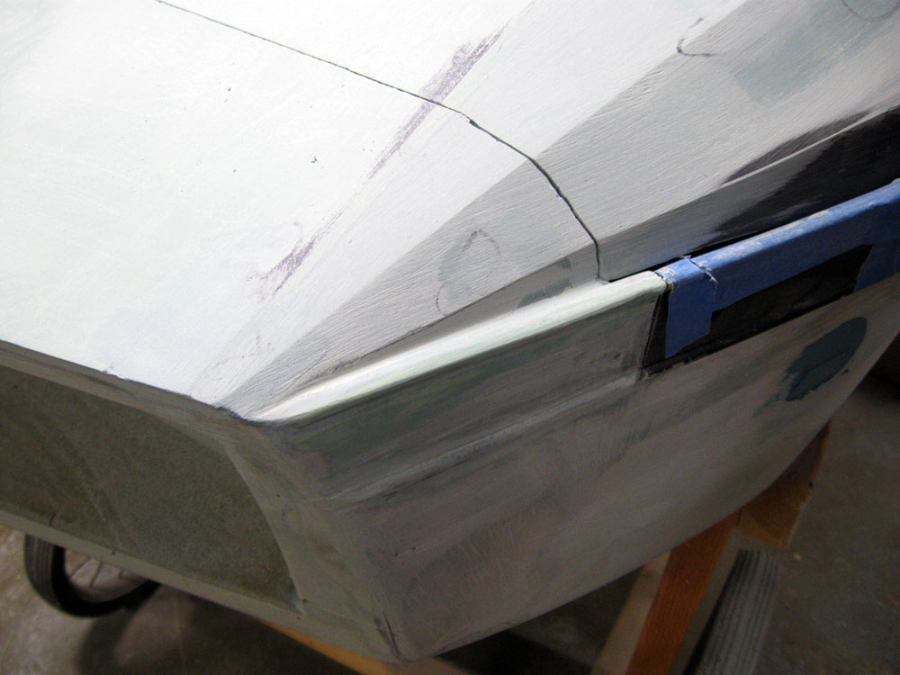 Over the last unit of time I have spent goodly hours on the RXL. Most of that time has been on the left front corner and blending the nose with the deck. You can now see how I intend to blend in the side bumper into the nose-one of you asked how I was going to do that.